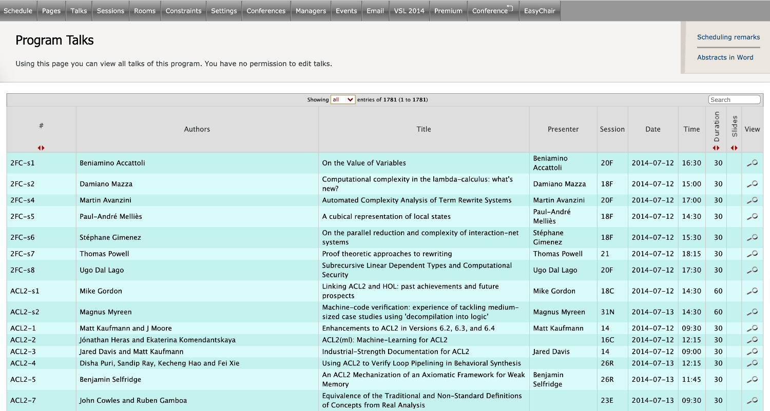 As an example, take a look at the Smart Program pages of VSL 2014, a mega-conference consisting of more than 10 conferences and nearly 100 workshops. Start browsing it from a day program, and then follow the links. On June 5, 2014, this program comprised of 2196 Web pages. Most of them were created automatically by EasyChair using data provided by the authors, program committees and program managers. In many cases this data was taken from submissions already available in EasyChair, so very little work, or no work at all, was required to use this data in the online program.