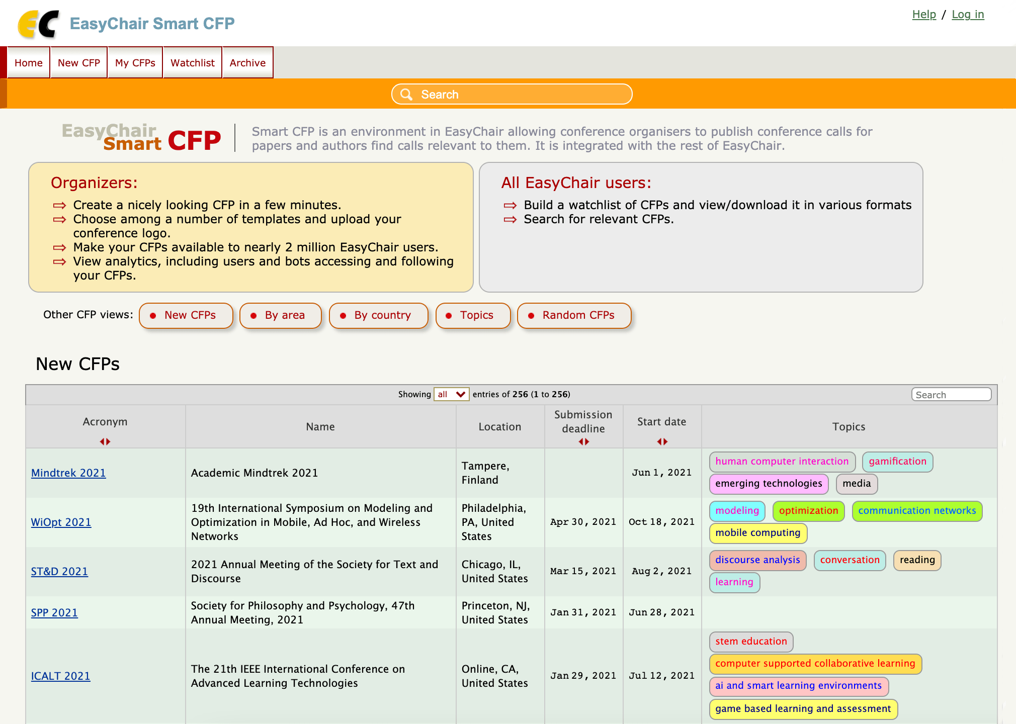 Within minutes, you can publish your conference call for submissions (Call for Papers) and reach our over 4 million users. With 2.1 million monthly visitors, your conference is guaranteed to reach your target audience. Our free to use CFP service acts as a platform for conference organizations to notify participants from all around the globe about their upcoming conference. Information such as conference name, venue, Program Committee, research area etc are all present at one glance, allowing participants to easily find their perfect conference.